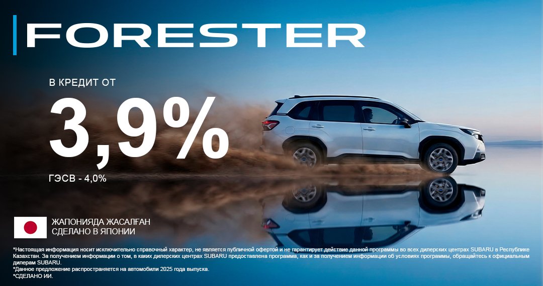 *Настоящая информация носит исключительно справочный характер, не является публичной офертой и не гарантирует действие данной программы во всех дилерских центрах SUBARU в Республике Казахстан. За получением информации о том, в каких дилерских центрах SUBARU предоставлена программа, как и за получением информации об условиях программы, обращайтесь к официальным дилерам SUBARU.